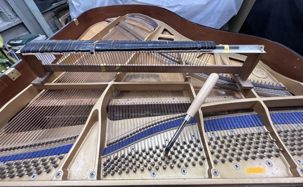 状態をご説明し、響板割れ処理や弦交換など