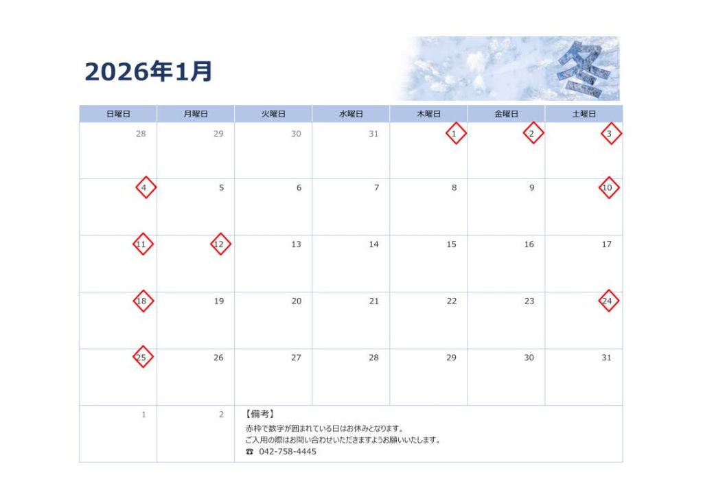 2026年1月の定休日をお知らせいたします。