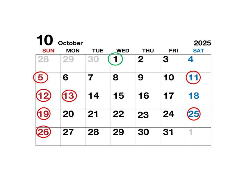 10月の定休日のお知らせをいたします。来月もどうぞよろしくお願いいたします!